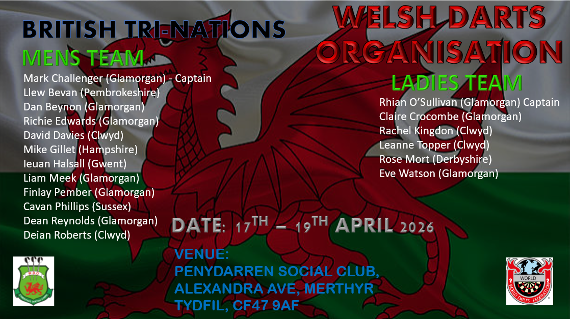 The Welsh Darts Organisation is the governing body of darts in Wales. As organisation we run the Welsh national team for Men, Ladies, Boys and Girls as well as providing several world ranking events including the Welsh Open.